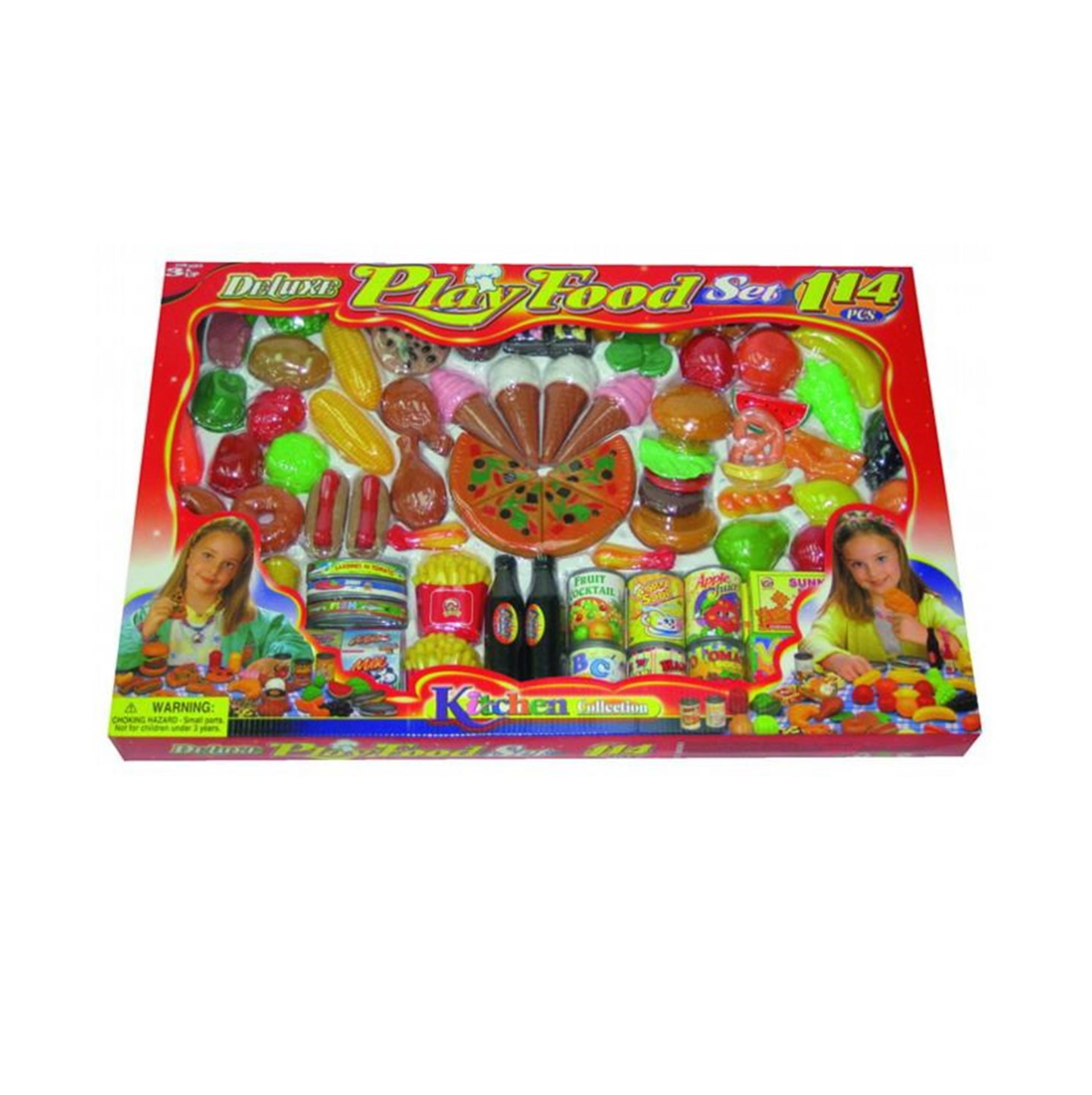 Sættet indeholder fx. pizza, is, fritter, hotdogs, frugt, kage, grønt etc.