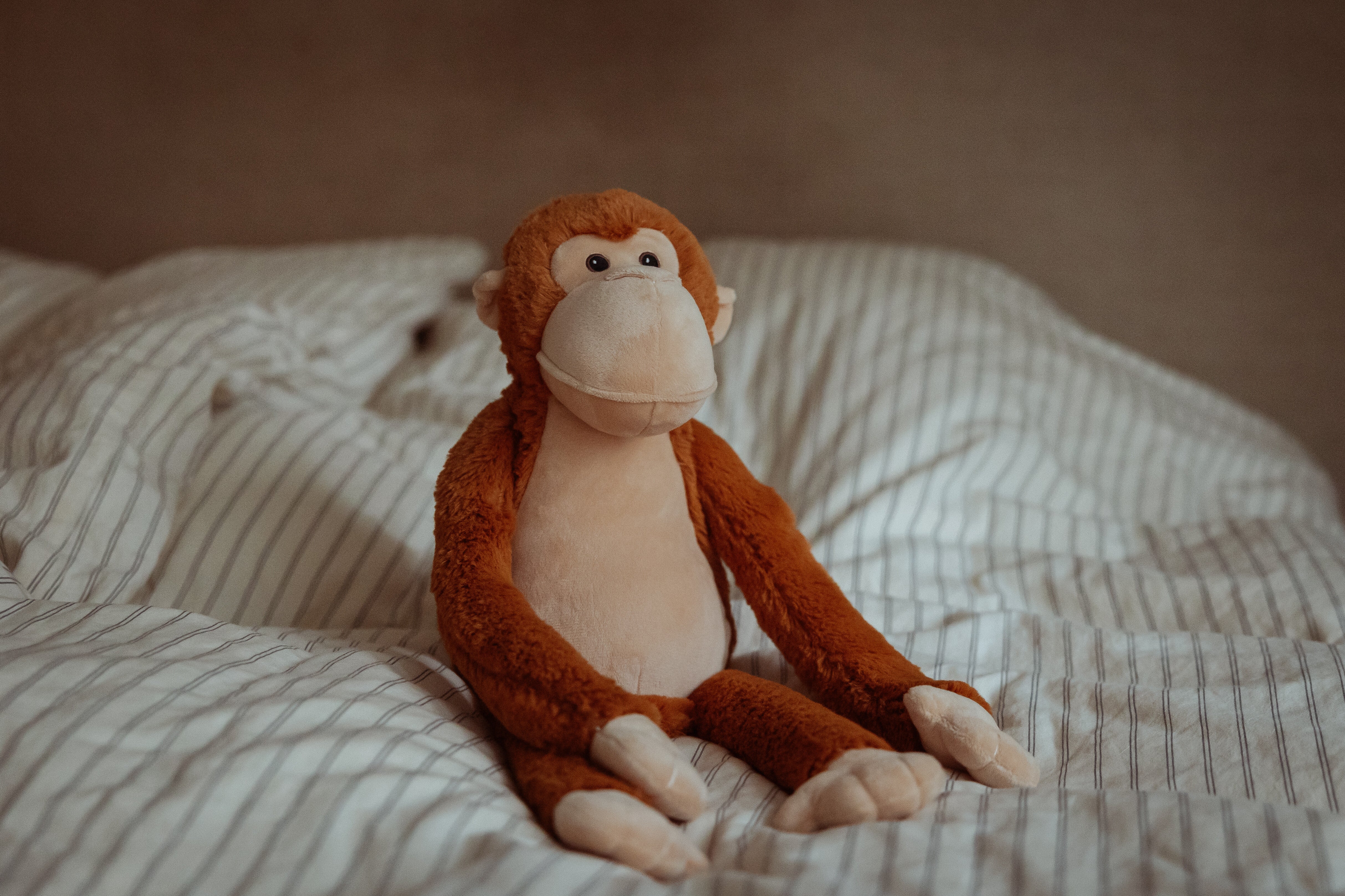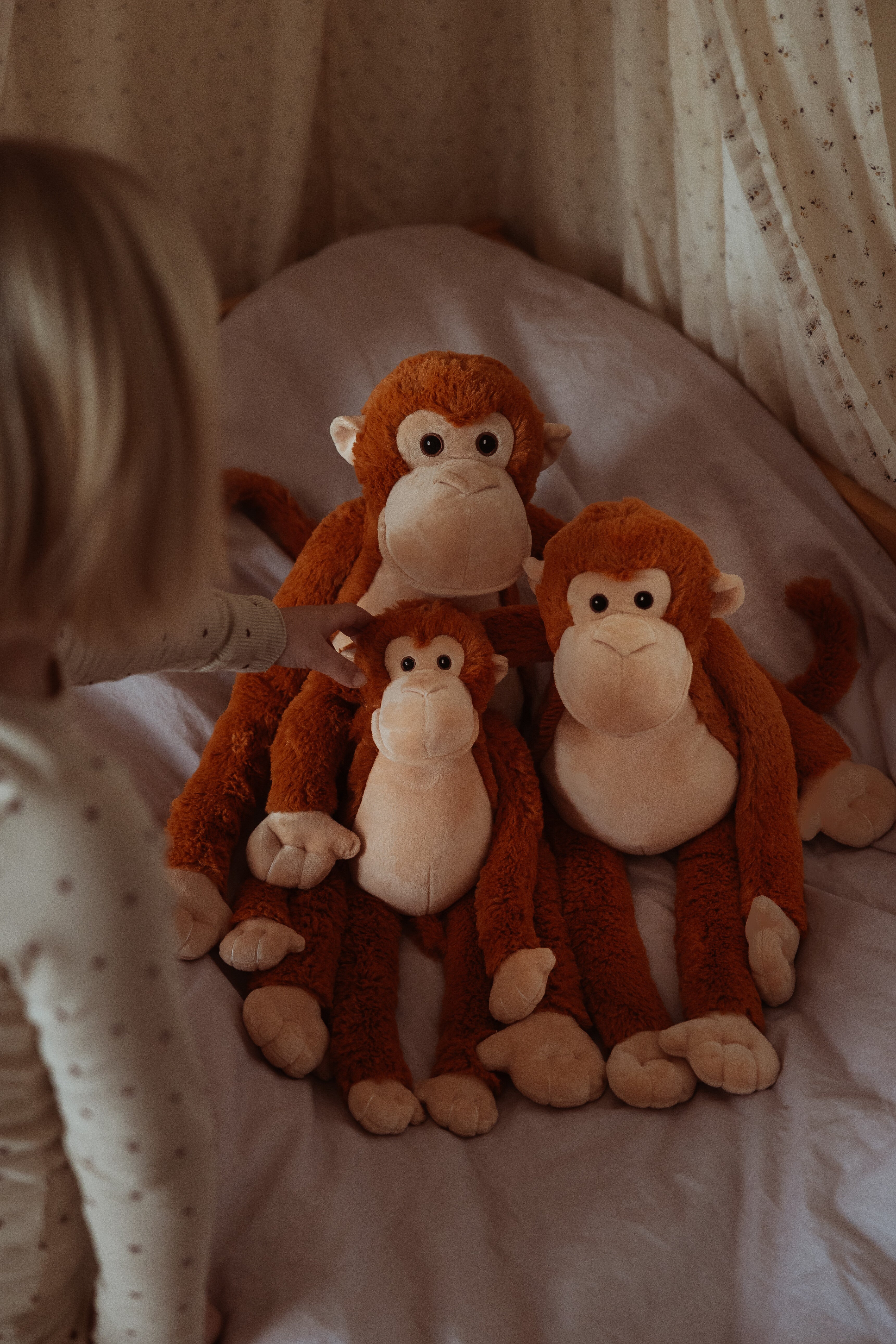 Med varme røde og sandfarvede toner, den blødeste pels, man kan forestille sig, og et sødt, omsorgsfuldt blik i sine øjne, er denne lille abe klar til at bringe komfort, hvor end den er nødvendig. Dens lette design gør det nemt for små børn at bære, kramme eller putte med den til lur, sengetid eller på farten.
