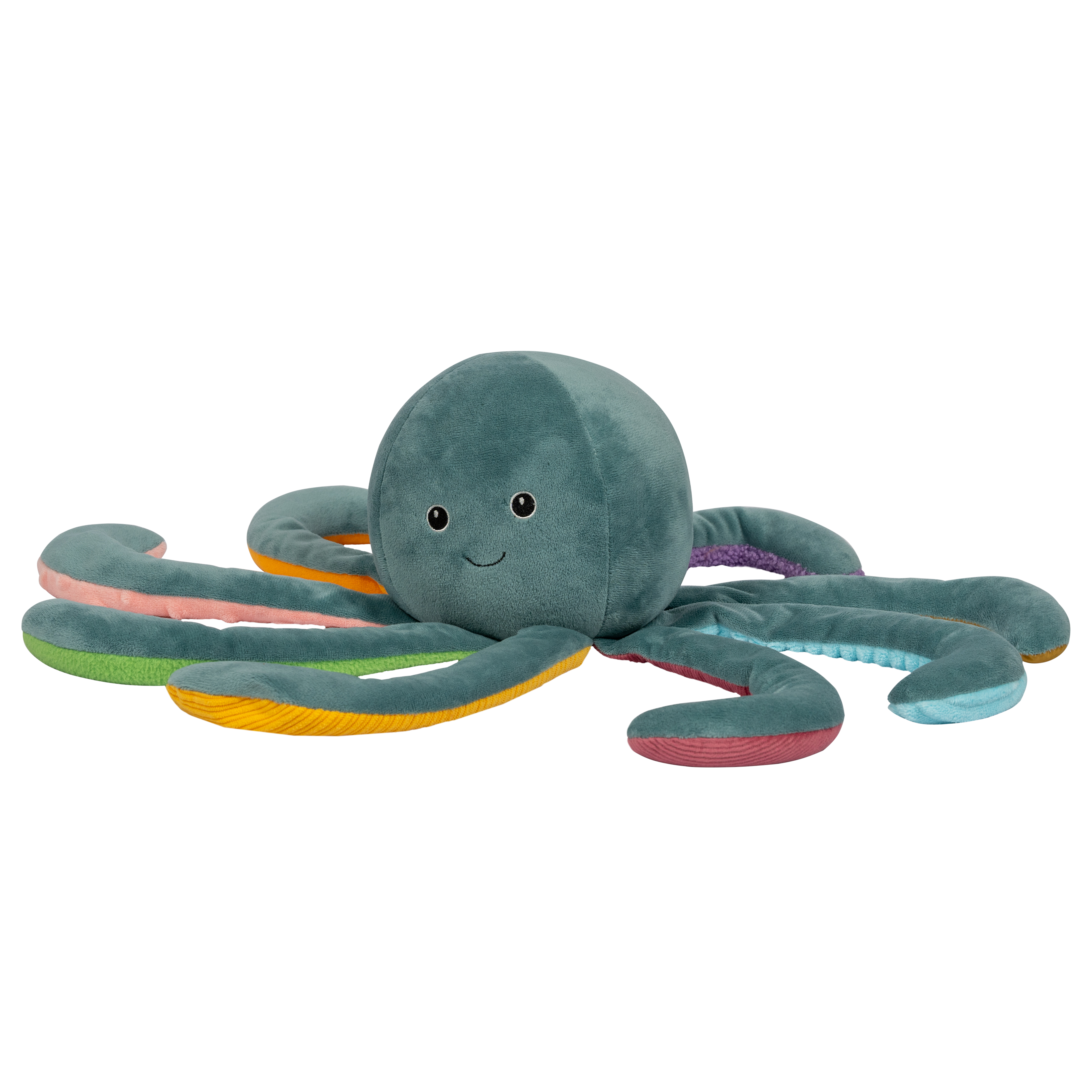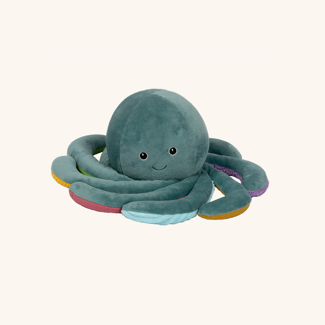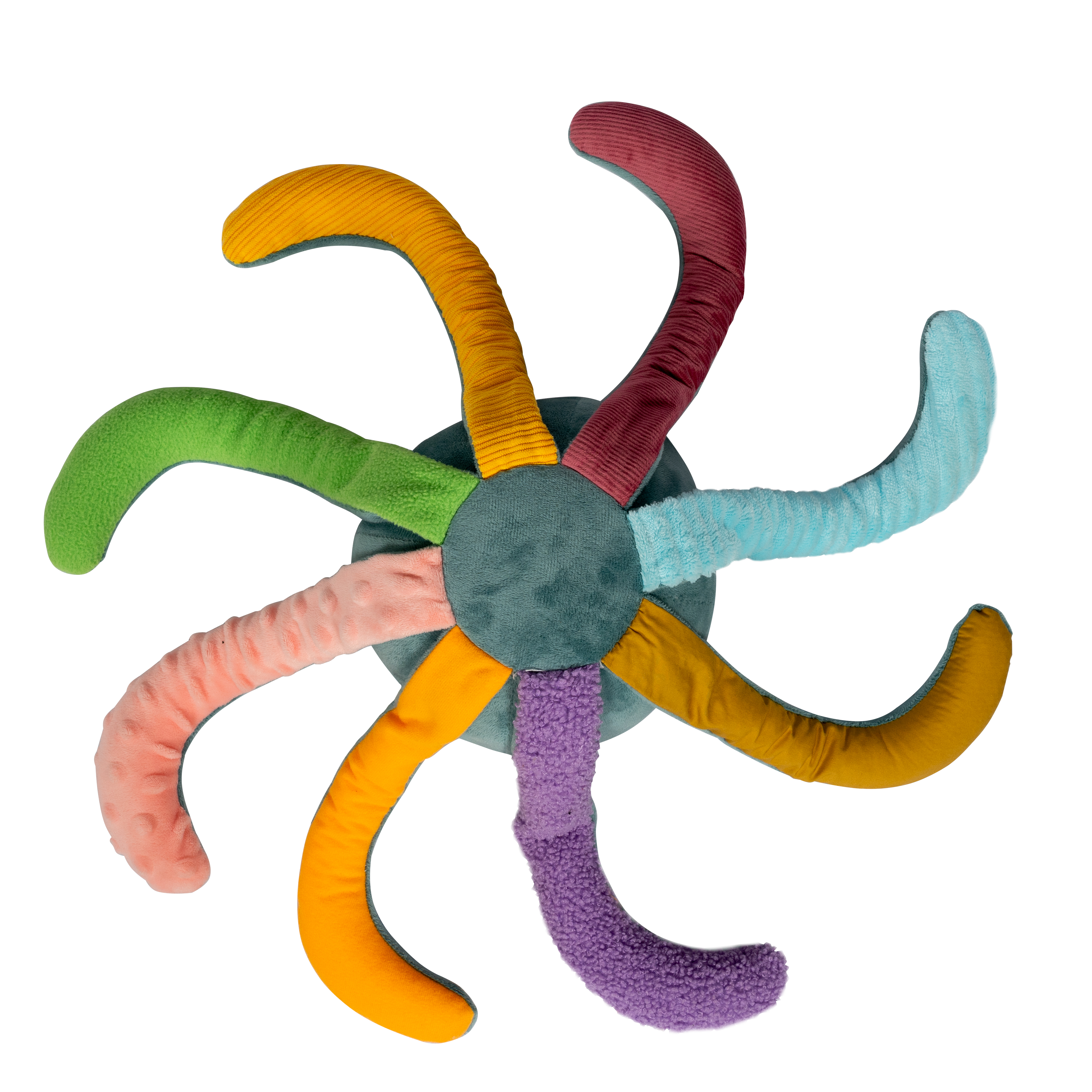 Med sine livlige, taktile arme tilbyder denne yndige tyngdeblæksprutte en unik sanseoplevelse for små børn. Hver arm har en forskellig tekstur og farve, hvilket opfordrer børn til at udforske og nyde forskellige former for sanseindtryk, hvilket gør den både engagerende og beroligende.