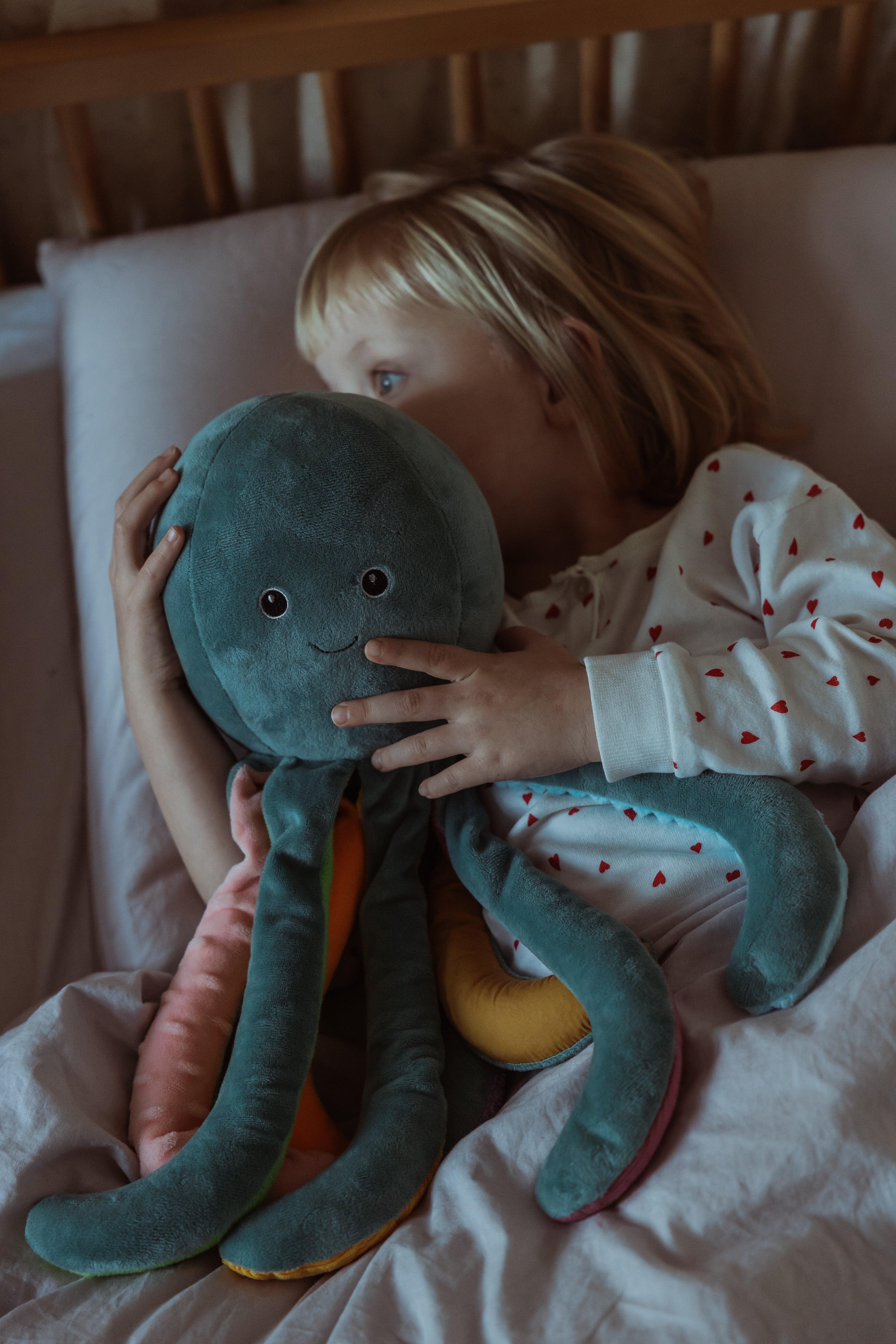 Med et muntert udtryk og et venligt smil har denne 1,2 kg tunge blæksprutte en tryg og beroligende tilstedeværelse, der appellerer til små børn. Perfekt til at slappe af på sofaen, kramme under stille stunder eller falde i søvn, er den designet til at bringe ro og afslapning i enhver situation.