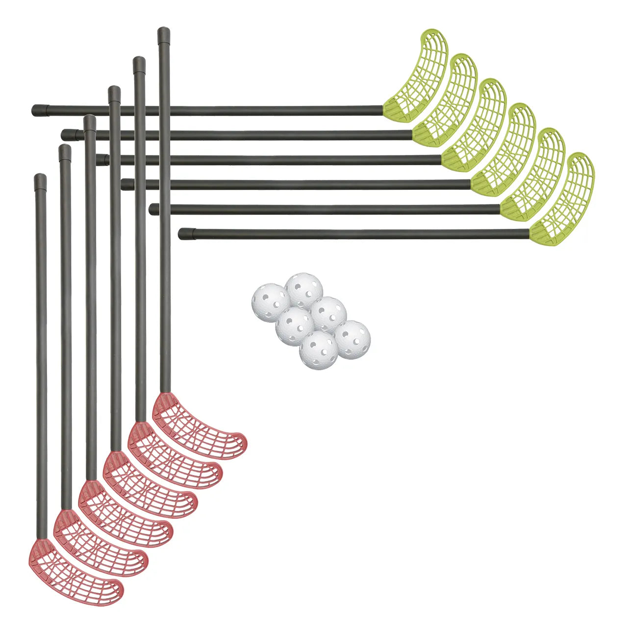 Sætet består af 12 stk. Twin PE stave (6 røde/6 grøne) og 6 stk. IFF godkendte floorball-bolde.