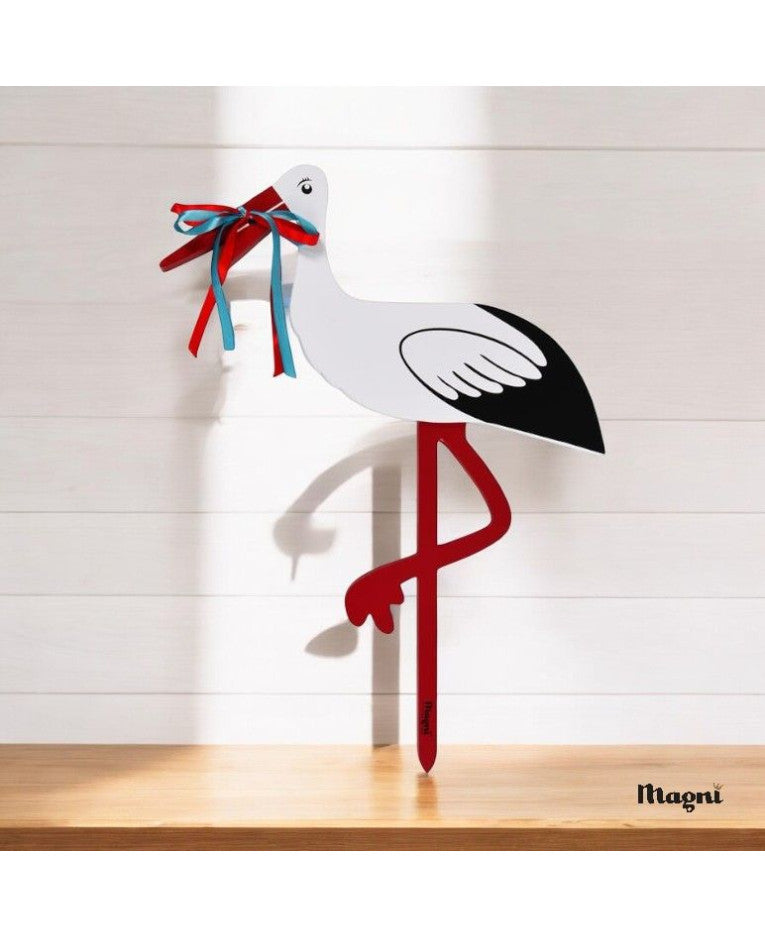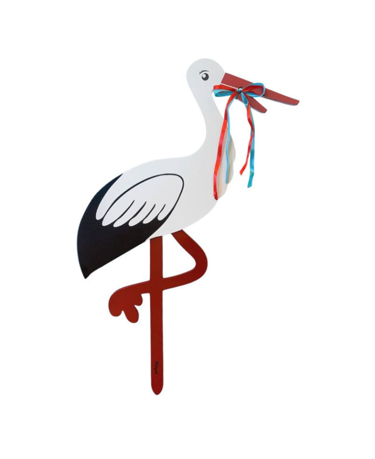 Til storken medfølger både et rødt og et blåt bånd, der bindes om næbbet på storken alt efter, om det er en dreng eller en pige, der er kommet til verden. Bemærk venligst: Træet er ikke imprægneret, og kan derfor ikke holde til at stå ude i regn og sne. Vi anbefaler at storken placeres under et halvtag eller lignende, så den ikke direkte bliver påvirket af fugt, da fugt kan skade træet.