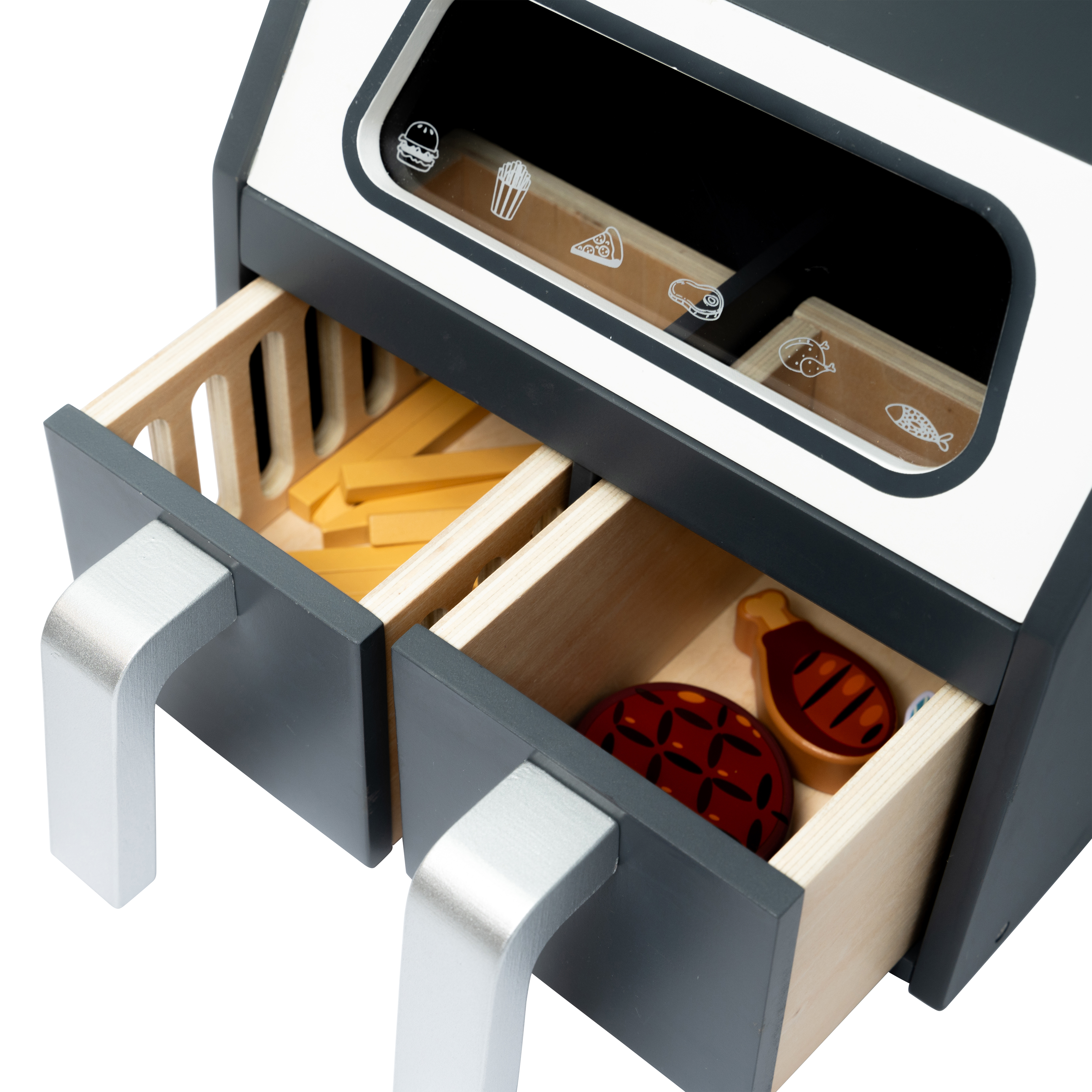 Den ene skuffe har lukkede sider, mens den anden skuffe har riller, hvilket gør den perfekt til at tilberede pomfritter. Gennem ruden med plexiglas kan de små kokke holde øje med deres kreationer, mens de bliver tilberedt.