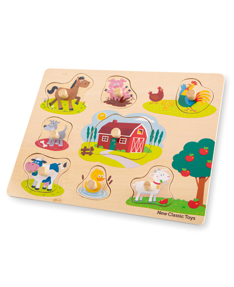 Knop puslespil Bondegård med 8 brikker, med motiver fra livet på en bondegård. Træet er FSC godkendt og knopperne har en god størrelse for de små barnehænder at holde fast i. Under hver brik, er det tegnet motivet, så barnet opnår en højere genkendelses effekt.