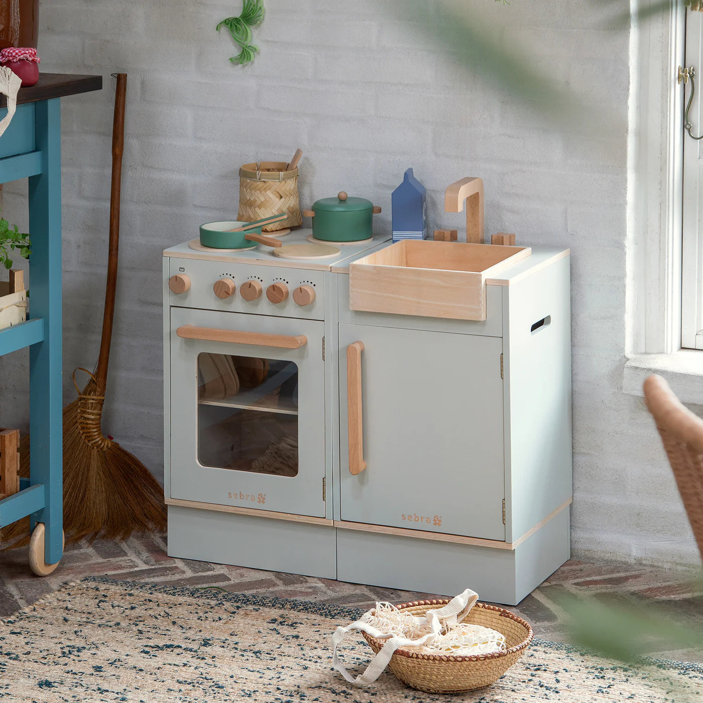 De praktiske håndtag, der er udfræset i siderne på komfuret, gør det nemt at flytte det rundt og sammensætte komfuret med andre moduler fra Sebra KIDchen-serien. Derved får du et fleksibelt legekøkken i træ, der kan tilpasses pladsen på børneværelset.
