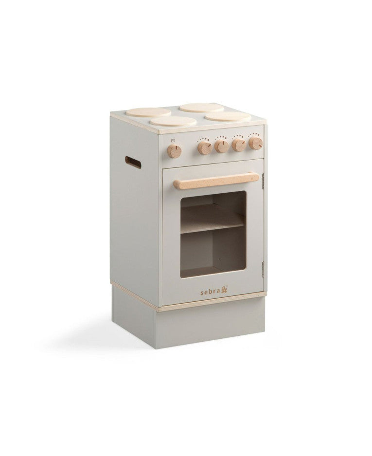 Robust legetøjskomfur i træ til børn der elsker at bage, stege og koge i køkkenet. Komfuret er virkelighedstro med 4 kogeplader, drejeknapper der siger klik når du drejer dem og en sidehængt ovnlåge. Inde i ovnen er der en plade, så legebarnet nemt kan bage fantasikager og -brød.